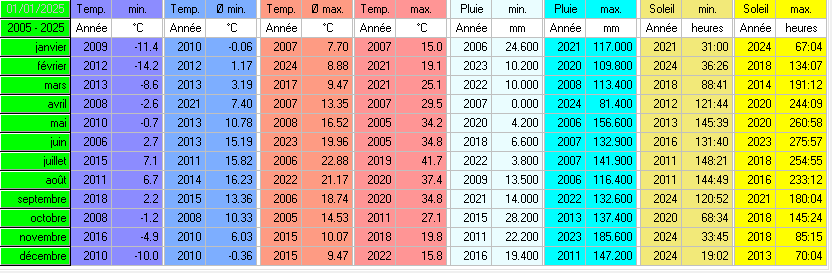 Les deux tableaux ci-dessous sont comparés aux normales de la station Météo France de Lille-Lesquin. - de 2005 à 2012 : normale de 2000 (moyennes de 1971 à 2000) - de 2013 à 2022 : normale de 2010 (moyennes de 1981 à 2010) - à partir de 2023 : normale de 2020 (moyennes de 1991 à 2020) |
