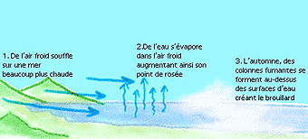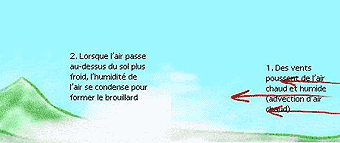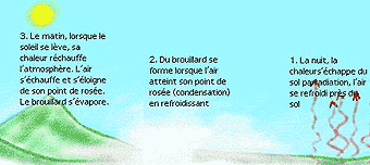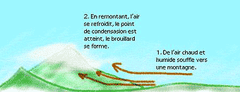 LA BRUMEIntroductionLa brume est un brouillard léger où la visibilité est supérieure à un kilomètre. La brume peut se former durant des journées très chaudes et très humides.Par beau temps, et surtout pendant une longue période sans nuages, on voit à l'horizon des bandes jaune "sale" et même rougeâtres, ressortant sur le fond bleu foncé. Plus haut, les tons bleus s'affaiblissent pour laisser apparaître un voile blanc grisâtre qui trouble la vue. Celui-ci peut être particulièrement épais en hiver, lors des hautes pressions et des inversions. Il s'agit de la brume.Particulièrement dense dans les villes et dans les zones industrielles; elle arrive à affaiblir la lumière du Soleil même en l'absence de nuages surtout si sa couche est épaisse. Les tons gris l'emportent de plus en plus, jusqu'à la limite du brouillard proprement dit.Il faut faire la différence entre la brume sèche et la brume humide.La brume sècheLa brume sèche, qui est le plus souvent accompagnée d'un peu de vapeur d'eau, se forme fréquemment pendant les périodes de beau temps.Elle est constituée par un mélange de poussières, de fumées, de sable et de particules d'impuretés qui s'élèvent du sol grâce aux mouvements tourbillonnaires. Cette perturbation peut être due à des caractéristiques spécifiques du paysage (par exemple les tempêtes de sable dans le désert), ou à des phénomènes liés à la civilisation, à la technologie et aux activités économiques : feux de forêts, fumées industrielles, gaz d'échappement des véhicules. Le plus souvent, les poussières naturelles et artificielles se mélangent et sont la cause de cette brume. Ces particules constituent des noyaux de condensation pour les précipitations.La brume humideMais un trouble de l'air, qui se traduit par une diminution de la visibilité, peut également provoquer le rassemblement de gouttes d'eau quand celles-ci sont suffisamment denses dans l'atmosphère. On parle alors de brume humide, laquelle peut engendrer rapidement du brouillard. Il suffit normalement d'un refroidissement minime pour que les gouttelettes, constituant la brume, s'accroissent.LE BROUILLARDIntroductionLe brouillard est un phénomène silencieux et dangereux qui peut mettre en péril la vie de l'homme moderne. En effet, lorsque la visibilité s'abaisse de manière importante, toute circulation (routière, aérienne, maritime...) peut devenir dangereuse si des précautions ne sont pas prises.Le brouillard est constitué de fines gouttelettes d'eau en suspension dans l'air, identiques à celles qui constituent les nuages. Il s'agit en fait d'un nuage, un stratus, en contact avec le sol. Le brouillard se présente sous la forme d'un voile opaque, parfois très dense, mais il peut aussi se présenter sous la forme de bancs, circulant à travers les campagnes. En météorologie, on parle de brouillard lorsque la visibilité est inférieure ou égale à 1.000 mètres. Au delà, on parle de brume jusqu'à une visibilité de 5 kilomètres.![]() Il existe plusieurs situations où le brouillard prend forme.Pour se former, le brouillard nécessite un taux d'humidité élevé, permettant la condensation de la vapeur d'eau par un refroidissement ou encore par un apport en humidité. Le vent ne doit être ni trop fort, pour éviter la dispersion des gouttelettes d'eau, ni trop faible pour empêcher leur suspension dans l'air. Il existe plusieurs types de brouillard.Le brouillard de radiationLe brouillard de radiation survient la nuit lorsque les conditions sont favorables (vents très faibles, humidité élevée, ciel clair). Durant cette période, le sol perd sa chaleur accumulée durant le jour (phénomène de radiation). Le sol devient froid. L'air au contact du sol se refroidit aussi. L'air se refroidissant, il atteint son point de rosée et l'humidité qu'il contient se condense. Un nuage touchant le sol se forme. C'est le brouillard.![]() Il se présente sous forme de bancs mais peut aussi se généraliser à de grandes étendues.Ce type de brouillard se forme souvent dans les vallées. La chaleur du soleil étant faible durant cette période de l'année, elle n'est pas suffisante pour dissiper le brouillard. Toutefois, il arrive que le sol puisse se réchauffer suffisamment pour faire évaporer une mince couche de brouillard au sol. La situation entrera dans l'ordre lorsqu'une dépression avec de bons vents pourra faire disparaître le brouillard.Le brouillard advectifTout d'abord, l'advection signifie un déplacement horizontal. Le brouillard advectif survient lorsque de l'air chaud et humide se déplace au-dessus d'un sol froid. L'air au contact du sol se refroidit pour atteindre son point de rosée. Il y a condensation de l'humidité. Le brouillard prend forme.![]() Ce genre de situation survient fréquemment au printemps lorsqu'il y a des poussées d'air chaud et humide du sud sur des régions encore couvertes de neige.Ce type de brouillard est souvent tenace même si la visibilité n'est pas particulièrement réduite.Le brouillard des flancs de montagne et de collinesLe brouillard peut aussi survenir au sommet des montagnes. Ce type de brouillard survient lorsque de l'air chaud et humide se déplace en direction de la montagne. En arrivant près de la montagne l'air se bute à ses flancs et débute sa montée. En montant, l'air se refroidit et atteint son point de rosée, l'humidité se condense et le brouillard se forme.![]() Le brouillard d'évaporation Le brouillard d'évaporation se forme souvent l'automne ou l'hiver alors que de l'air froid souffle sur une surface d'eau beaucoup plus chaude. L'eau, en s'évaporant, augmente le point de rosées pour éventuellement atteindre la température que l'air. Il y a condensation et le brouillard naît.![]() Ce type de brouillard n'est pas très dense et il se présente souvent sous la forme de bancs.Le brouillard de mélangeIl se produit par le refroidissement d'une masse d'air chaud par mélange