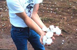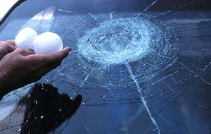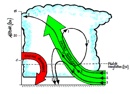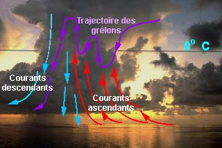 Saviez-vous que les cristaux de glace, la vapeur d'eau et les gouttelettes d'eau doivent subir plusieurs transformations avant de devenir un seul grêlon dans un nuage?![]() L'INTÉRIEUR DES GRÊLONSMais pourquoi Glacerin possède-t-il des zones blanches et des zones translucides?On pourrait comparer l'intérieur d'un grêlon à un oignon. Comme ce dernier, le grêlon possède différentes couches, la glace transparente alternant avec la glace opaque. Le degré de transparence d'un grêlon dépend de la vitesse à laquelle l'eau gèle sur le grêlon. Si la glace gèle rapidement, la couche est blanche, car les petites bulles d'air restent emprisonnées dans la glace. Si au contraire la glace gèle lentement, les bulles d'air ont le temps de s'échapper avant que la congélation ne soit terminée et cela produit de la glace translucide.![]() Nous avons alors :Glace translucide si l'eau gèle lentementGlace opaque (blanchâtre) si l'eau gèle rapidementLA FORME DES GRÊLONSMais quelle sera la grosseur de Glacerin ?Glacerin doit avoir un diamètre de 5 mm ou plus pour qu'on puisse l'appeler un grêlon.Il peut par contre devenir très gros! Comme celui-ci.![]() Les plus gros grêlons du monde sont tombés en 1986 au Bangladesh. Ces grêlons avaient un poids de 1,02 kg (2,251 lb) et ont causé la mort de 92 personnes (Records Guinness, 1993).Mais est-ce que tous les grêlons ont la même forme ? Les grêlons sont habituellement de forme sphériqueMais ils peuvent avoir d'autres formes, comme celui-ci.![]() TRAJECTOIRE DES GRÊLONS DANS LES NUAGESLa grêle ne peut se former que dans les nuages avec de grands courants vers le haut. Le seul type de nuage pouvant avoir des courants assez forts pour supporter un grêlon se nomme cumulonimbus.![]() La grosseur des grêlons dépendra de la trajectoire parcourue par les embryons ou particules dans le cumulonimbus. La zone de formation à l'intérieur du nuage se nomme supercellule. Les plus gros grêlons se forment lorsque les embryons voyagent près d'un puissant courant ascendant.![]() En effet, les particules qui empruntent la trajectoire numéro 1 sont transportées vers le haut par le courant ascendant et en sont éjectées de telle sorte que leur trajectoire de chute croise de nouveau ce courant ascendant. Il y a donc recirculation des particules dans la cellule de formation et, par le fait même, croissance des grêlons.Les particules qui suivent la trajectoire numéro 2 sont très rapidement portées en altitude et éjectées de la supercellule au sommet du cumulonimbus. Ces particules sont donc plus fines du fait qu'elle sont transportées très rapidement et sortent du nuage sous forme particules glacées plus petites que des grêlons.Les particules qui suivent la trajectoire numéro 3 voyagent également aux abords du courant ascendant mais sont éjectées très rapidement. En fait, ces particules ne dépassent que de très peu l'altitude du point de congélation à l'intérieur du nuage et retombent au sol sous forme de petits grêlons ou de gouttes de pluie selon l'épaisseur de la couche d'air entre le sol et l'altitude du point de congélation.![]() Le grêlon peut aussi suivre une trajectoire comme celle-ci. Il peut monter et descendre dans le cumulonimbus à plusieurs reprises. Finalement, lorsque le grêlon est trop lourd et que les courants ascendants n'arrivent plus le transporter vers le haut, il tombe. En tombant, la glace fond, car l'air est plus chaud vers le bas. Si elle ne fond pas complètement, on se retrouve avec des précipitations de grêle au sol.LA GRÊLE : QUAND ET OÙQuand la grêle a-t-elle le plus de chances de se former et ainsi de tomber au sol ?Près de 85 % des orages de grêle se produisent durant les mois de mai, juin, juillet et août.Pendant la journée, les orages sont plus développés entre 12 h et 22 h. C'est donc à ce moment que Glacerin a le plus de chances de se former.LES DOMMAGES CAUSÉS PAR LA GRÊLEEn tombant, surtout à l'intérieur des continents peuplés, la grêle détruit les produits de l'agriculture.![]() Elle peut aussi briser des voitures...![]() Et causer des accidents routiers...![]()