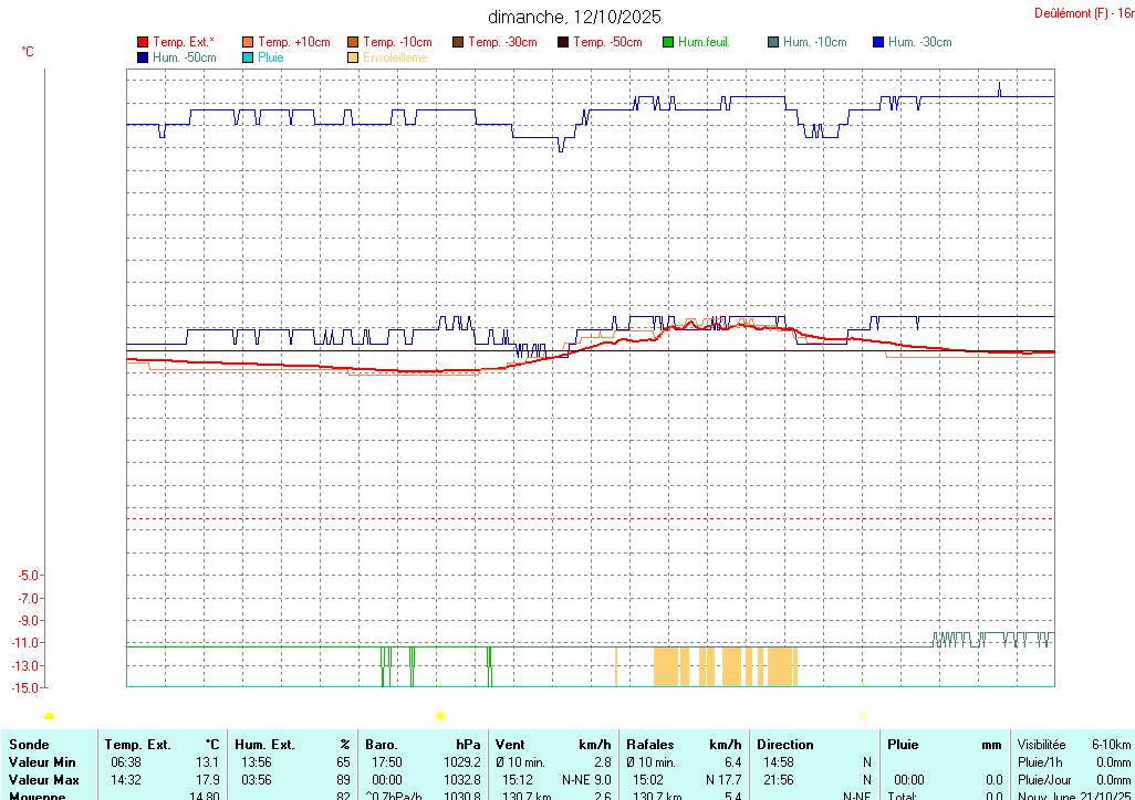 •  La courbe fine orange représente la température extérieure à 10 centimètres en degré Celsius (°C).