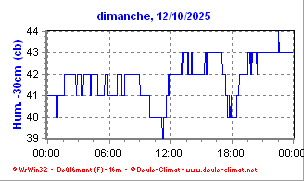 •  La courbe fine bleu moyen représente l'humidité du sol à 30 centimètres en Centibars (cB).