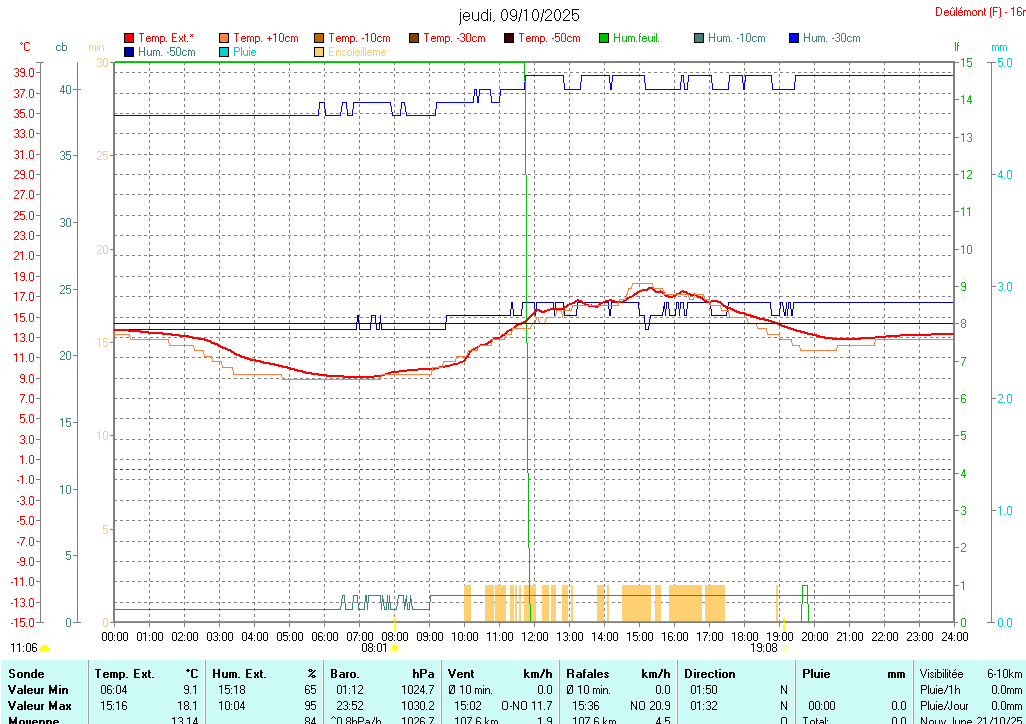 •  La courbe bleue claire épaisse représente la quantité de pluie cumulée en millimètre (1mm et 1litre/m² sont équivalents). Le bâtonnet bleue claire représente la quantité de pluie tombée en 2 minutes.