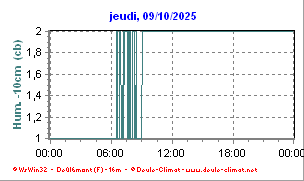 •  La courbe fine bleu moyen représente l'humidité du sol à 30 centimètres en Centibars (cB).
